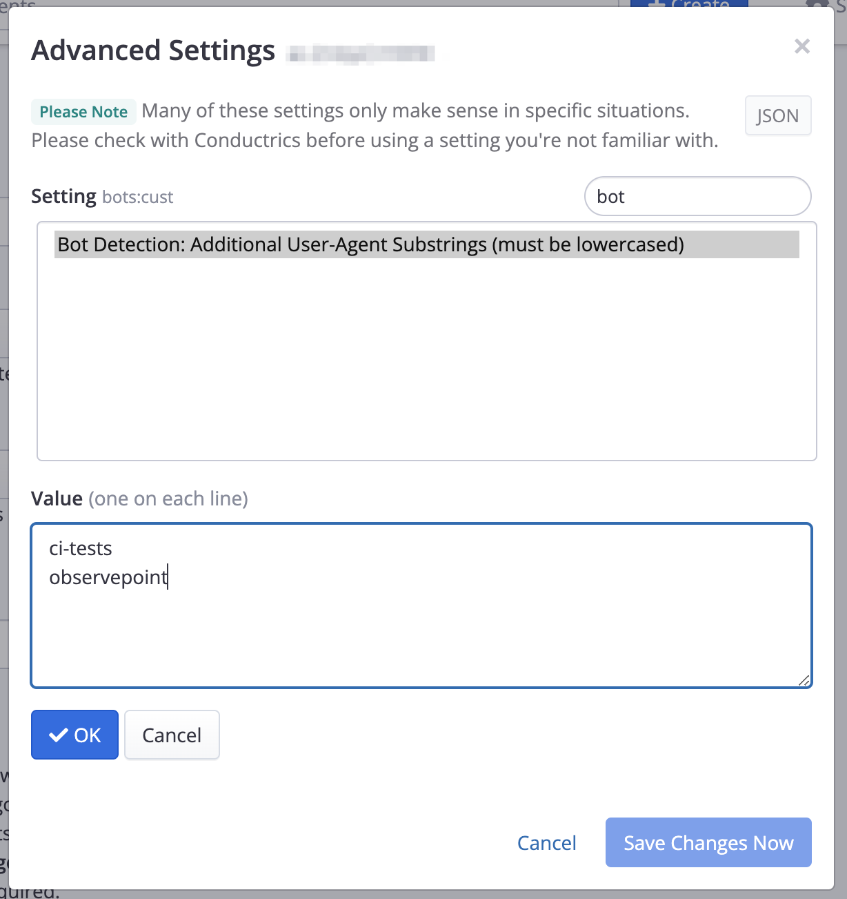 In the Conductrics Admin, go to Settings > Company Preferences, then hit Advanced Settings and add a Bot Detection: Additional User-Agent Substrings setting. For the Value, provide each substring, one per line, that you want to be treated as a bot.