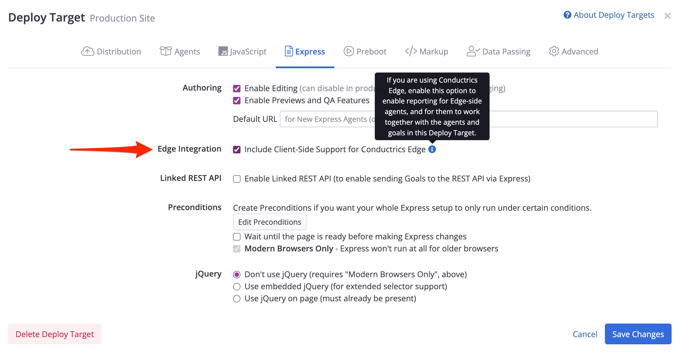 <script>tag must be present on your pages in order for Conductrics Edge to work correctly, and the Include Client-Side Support for Conductrics Edge must be enabled for that client-side Express Deploy Target (see screenshot above). Otherwise, you may find that your Edge-side experiments don't show up in the Conductrics reporting. Feel free to contact Conductrics if you have any questions.