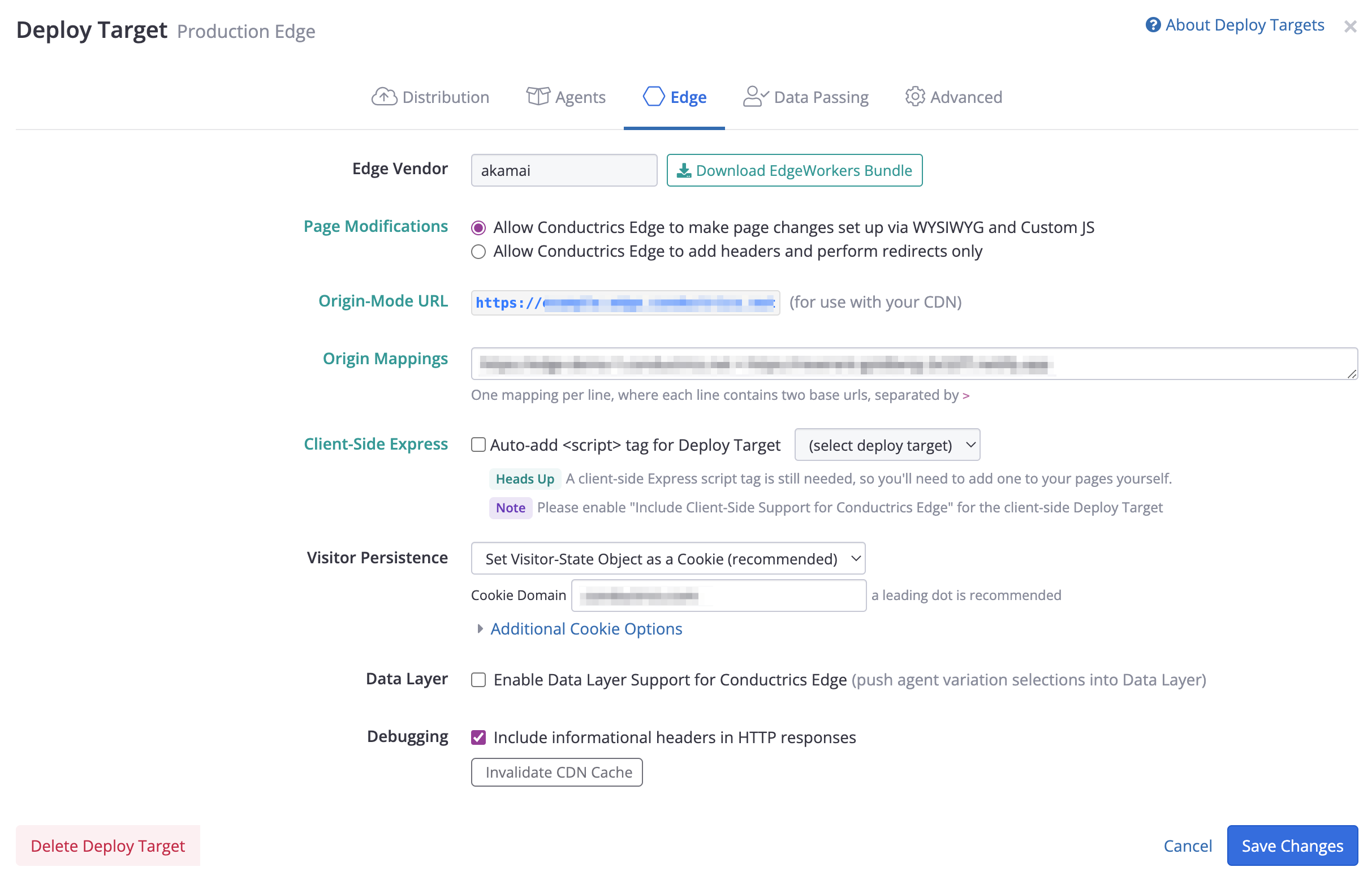 - If you don't need that ability, you can choose the Allow Conductrics Edge to add headers and perform redirects only option instead. Note that if you choose the first option, you will need to add a "Conditional Origin" if using Akamai (see Akamai Setup for details).