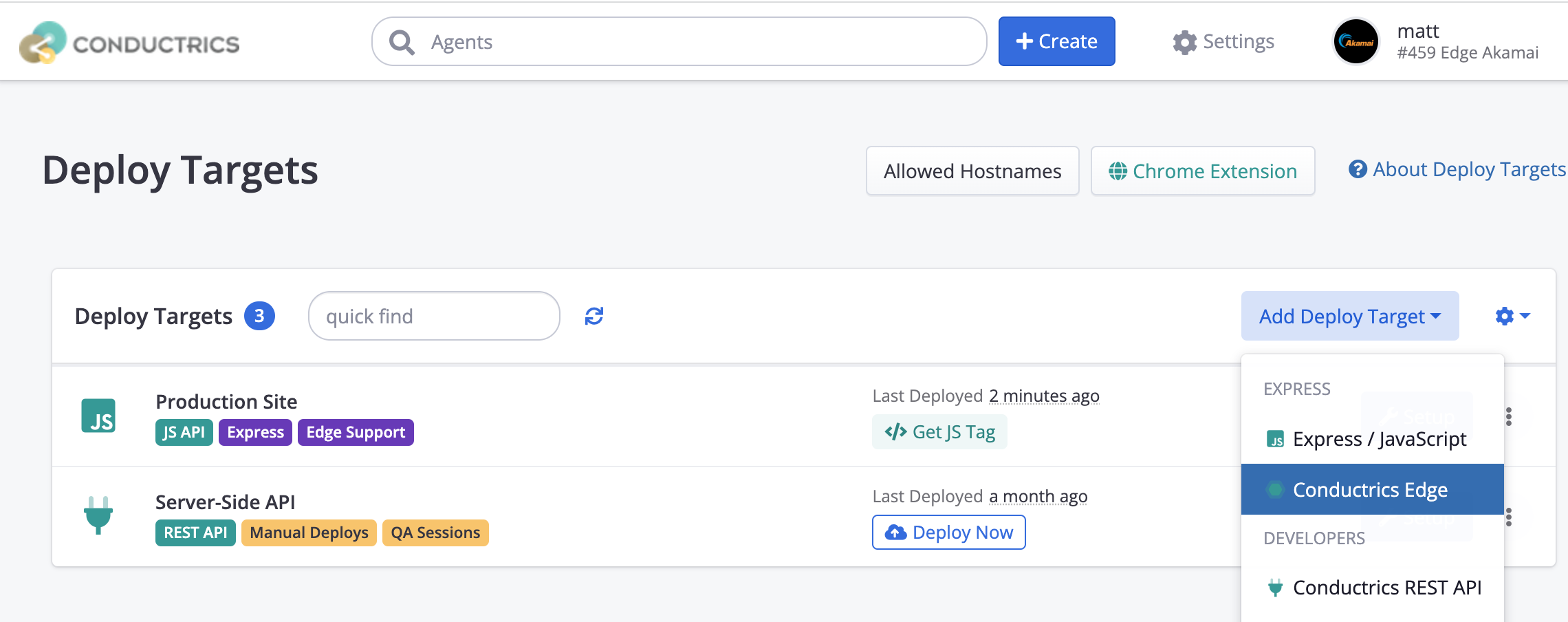 The first step is to create an "Edge" Deploy Target in your Conductrics account. In the Conductrics admin, go to Settings > Deploy Targets, then hit Add Deploy Target and choose "Express Edge" as shown below: