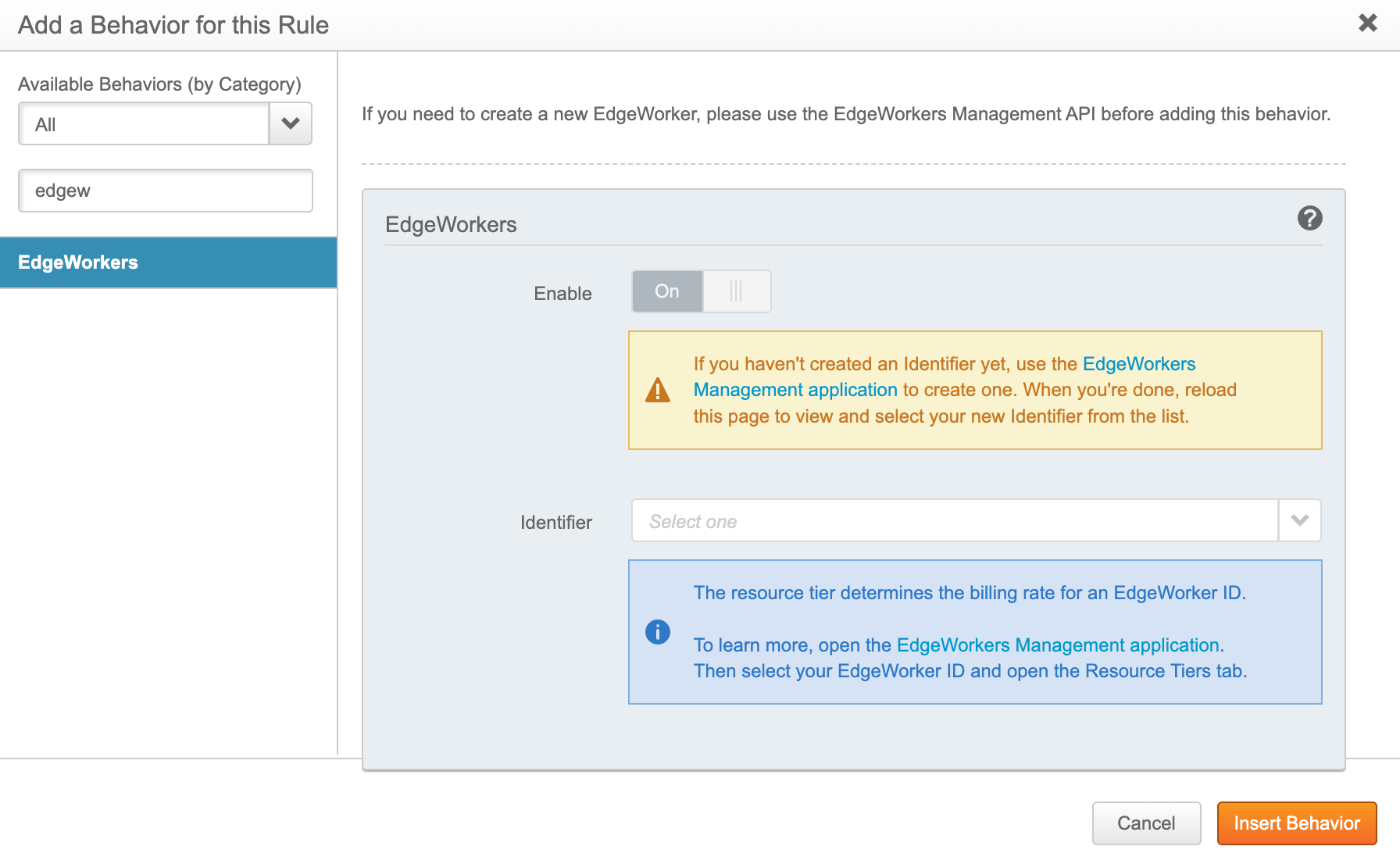 - In the window that appears, search for the EdgeWorkers behavior as shown below.