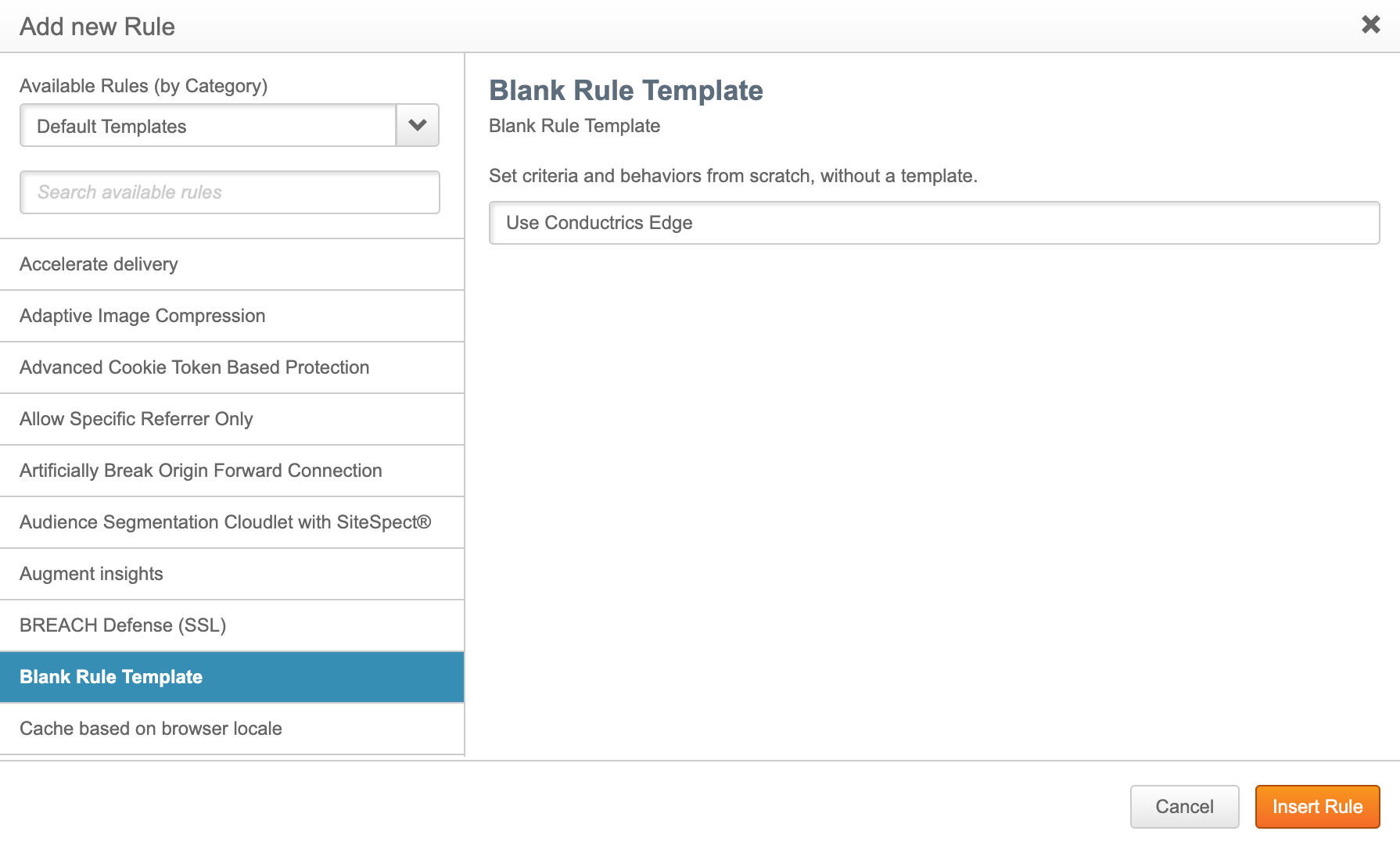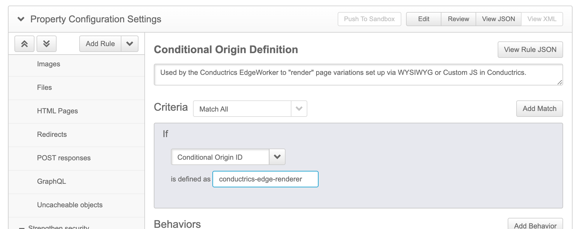 Next, we'll add the EdgeWorkers behavior to pass the request to the Conductrics Edge worker for the pages that match the rule criteria you provided above.