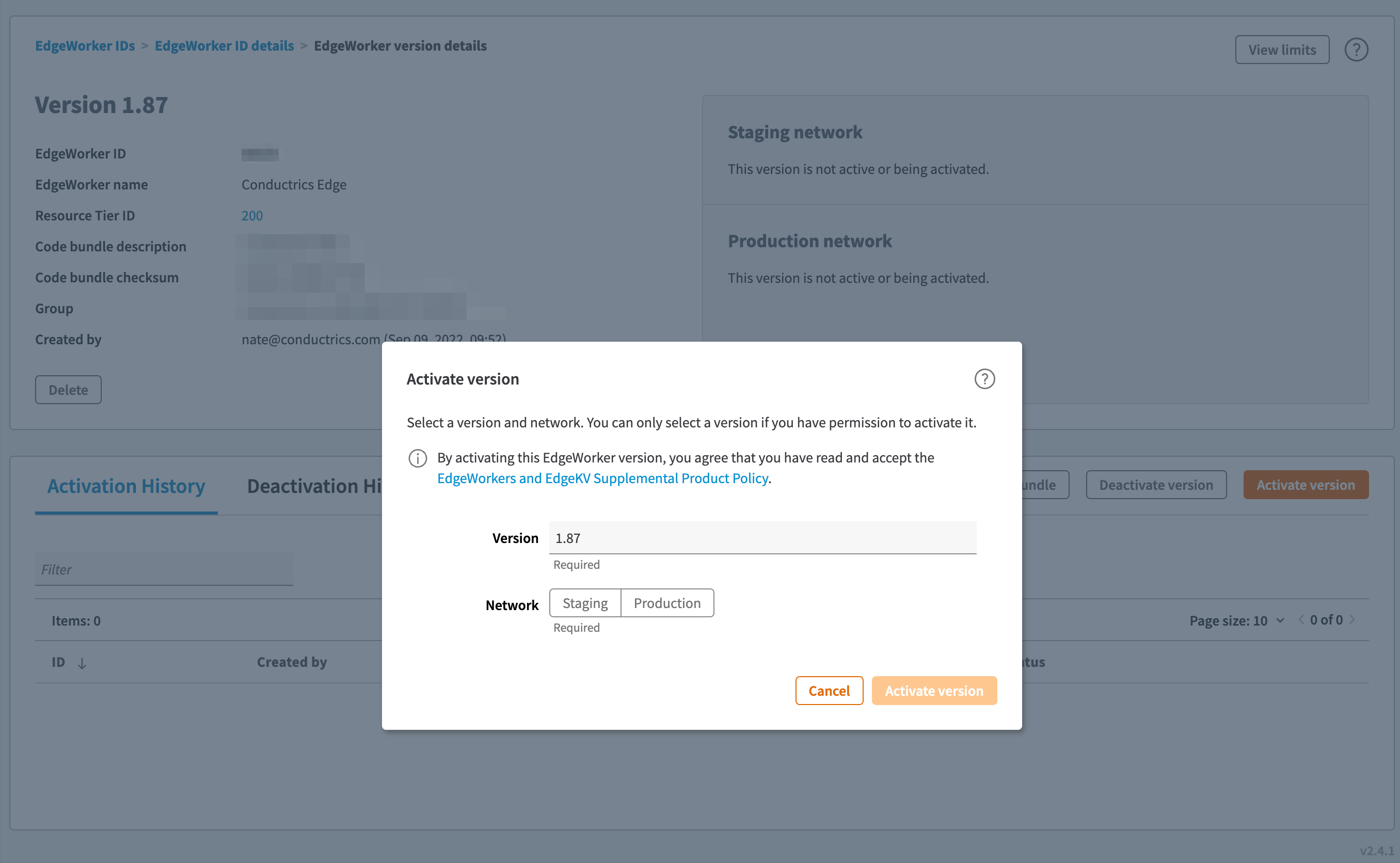 - Choose Staging or Production as desired, then click Activate Version.