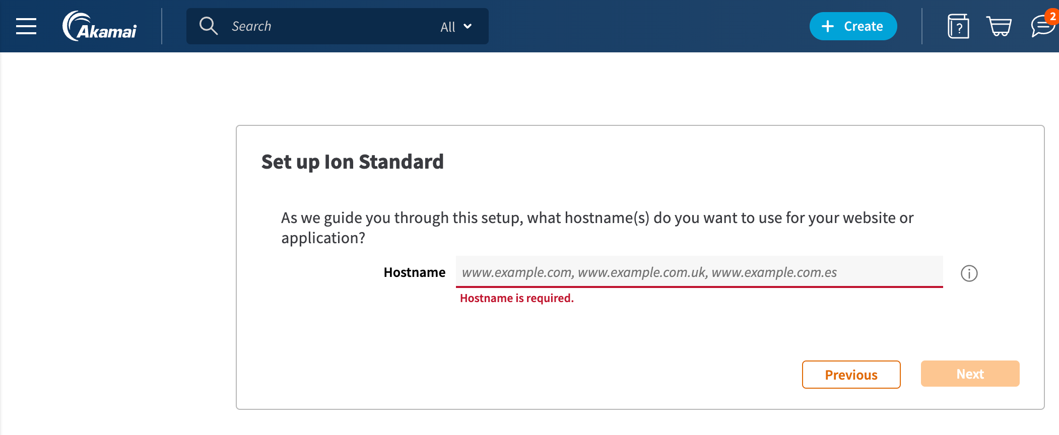 The first bit of information you'll need to provide is the normal URL for the site that you want to try out Conductrics Edge with. You can use your company's normal website, a staging version of your company's website, or any other "example" website that you may have access to. Provide that URL as the public Hostname in the Akamai setup step shown below.