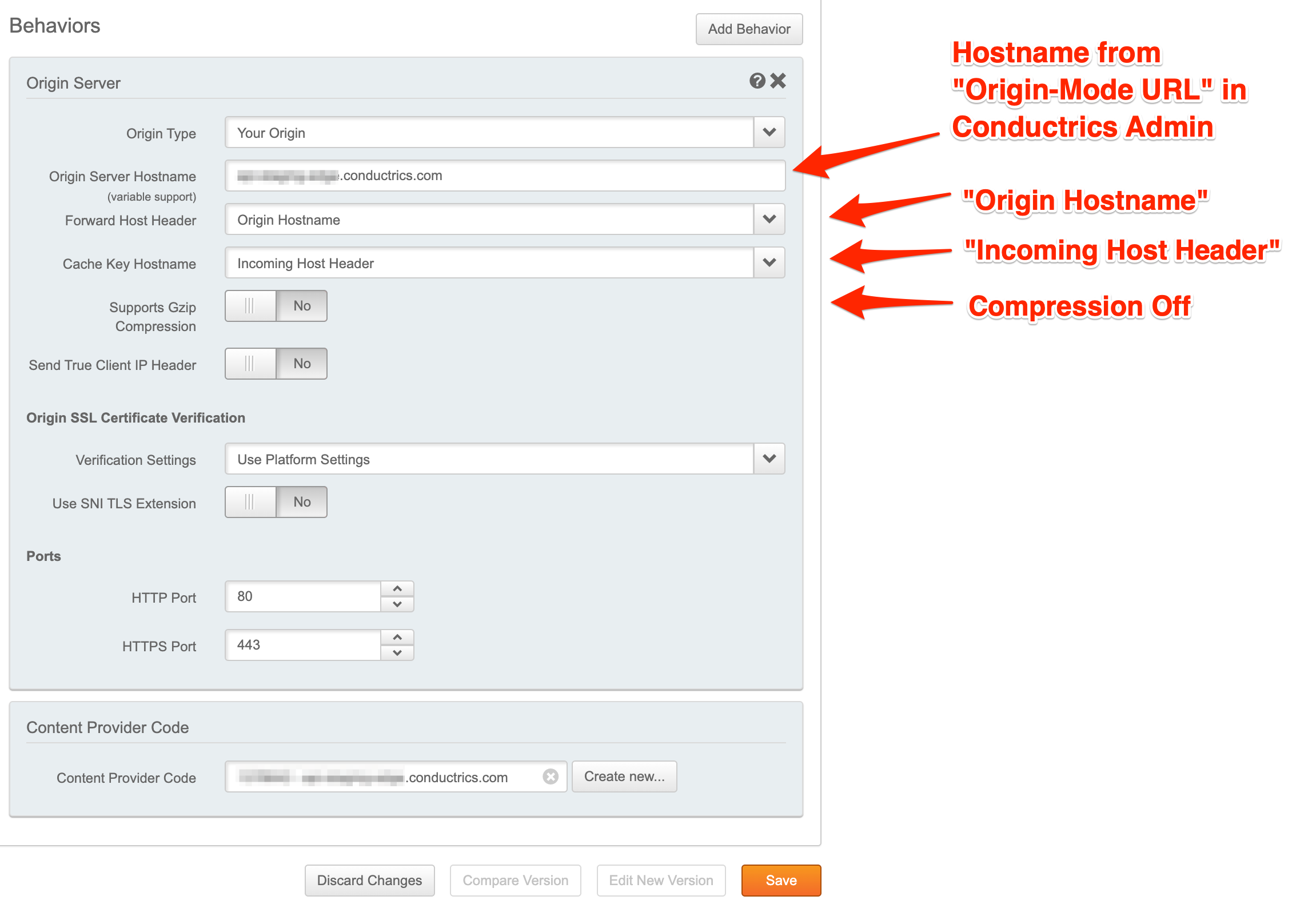 - For the Origin Server Hostname, provide the hostname portion of the Origin-Mode URL from the Conductrics Admin (see additional screenshot below this one). For instance, if the Origin-Mode URL shown in the Conductrics Admin shows