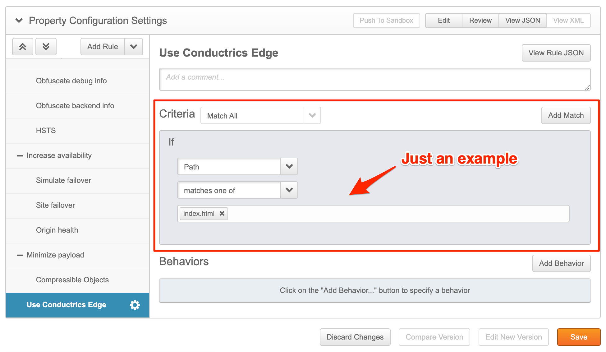 You don't have to set up an Example Property. If you already have an existing Property in Akamai that you want to use Conductrics Edge with, you can use that Property instead.