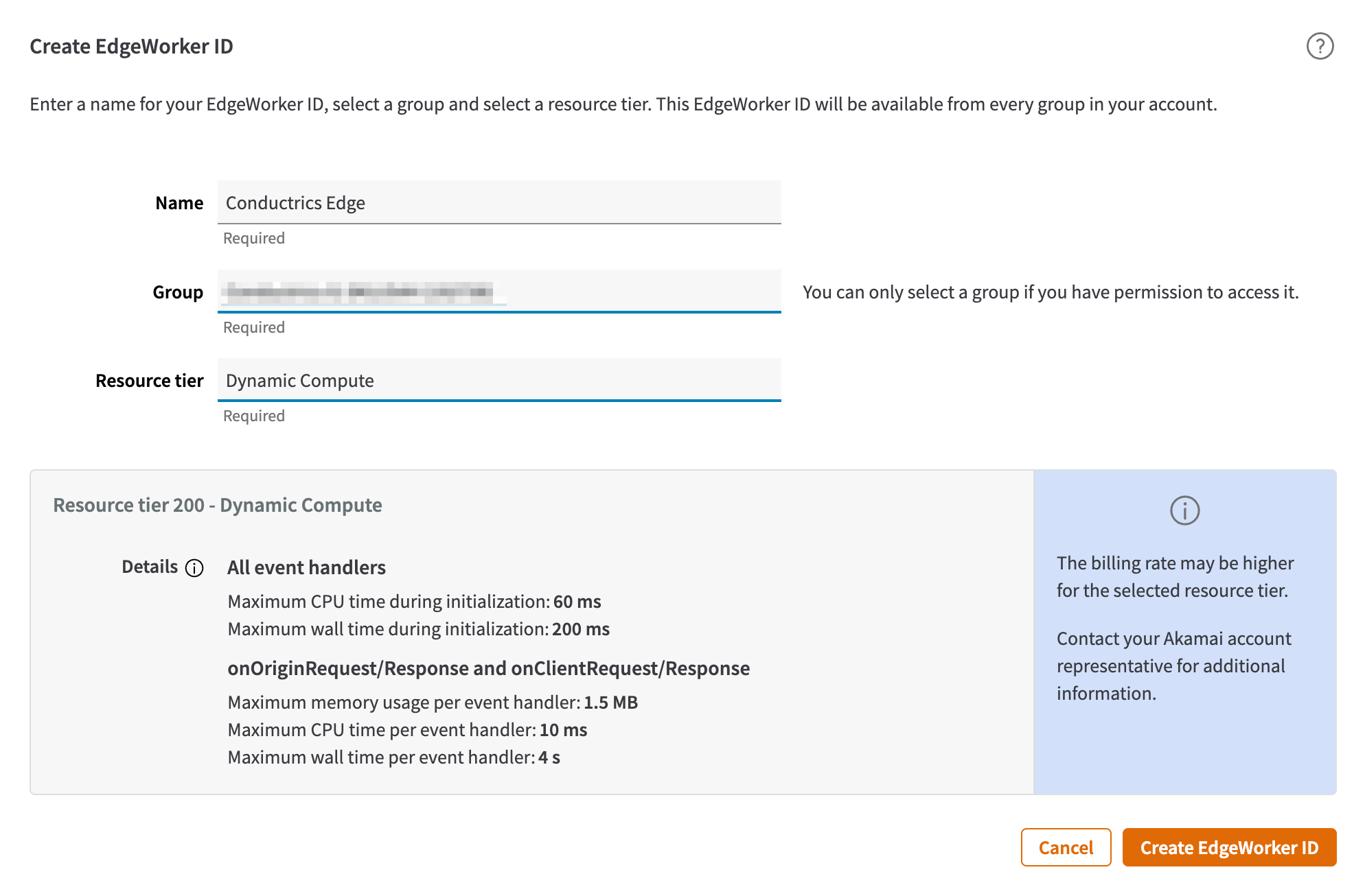 - Hit the Create EdgeWorker ID button to get to the form shown below.