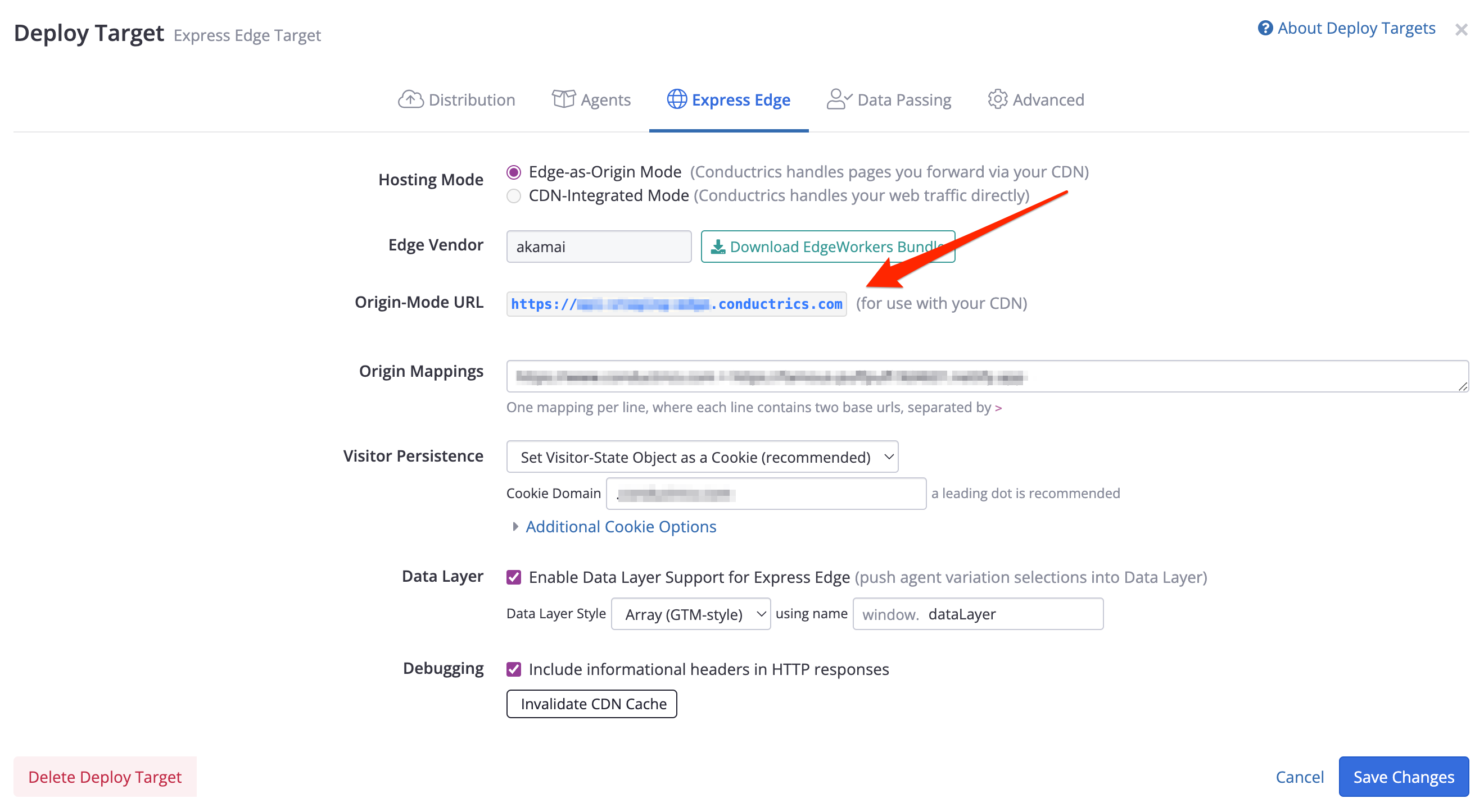 Here's where you'll find the Origin-Mode URL in the Conductrics Admin, under Settings > Deploy Targets, then hitting Setup for your Conductrics Edge deploy target: