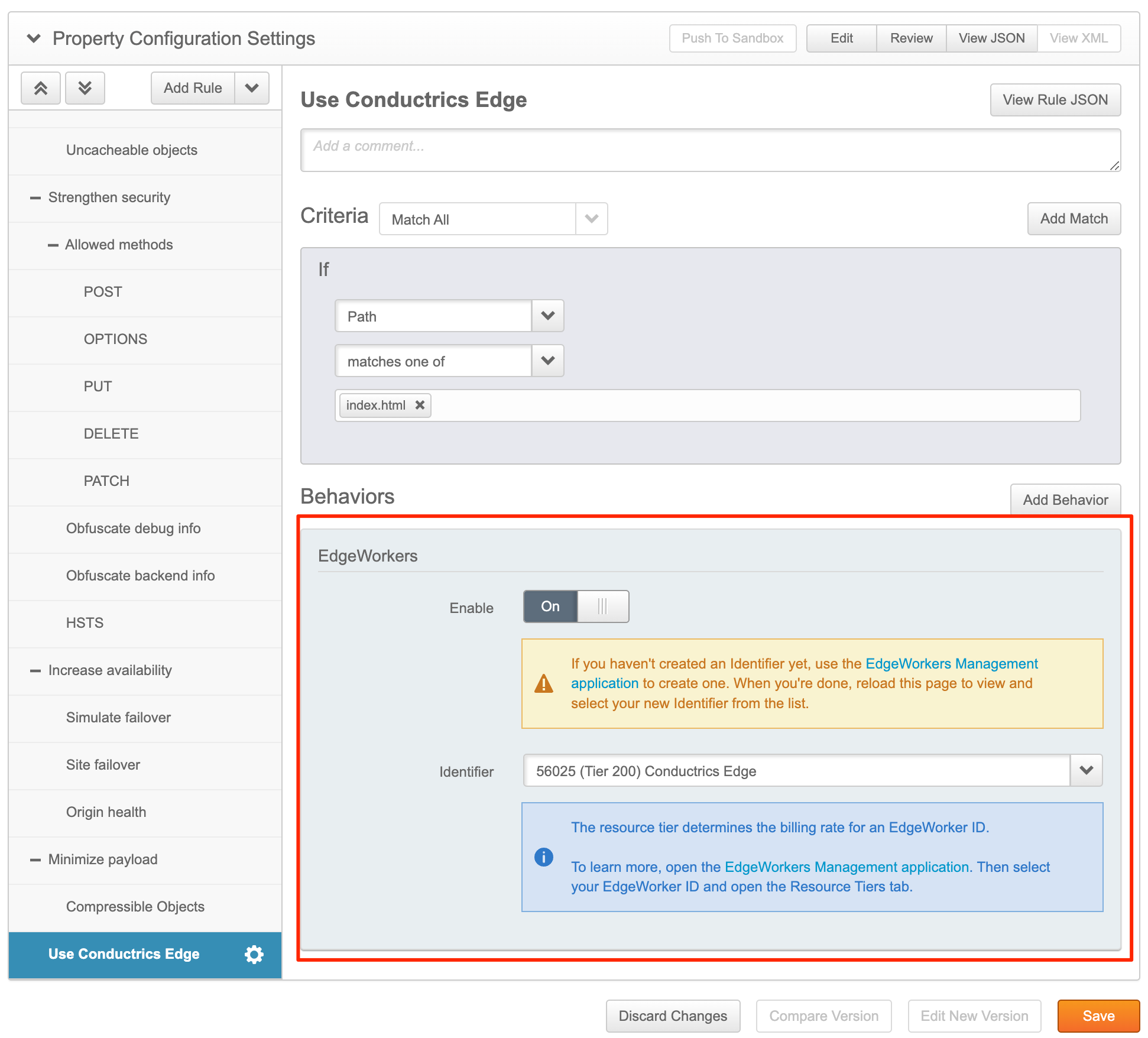 Note that the Enable switch shown above gives you a quick and easy way to enable/disable Conductrics Edge globally for your entire property from the Akamai side. Just flip the switch, save your changes, and then deploy to Staging or Production as needed.