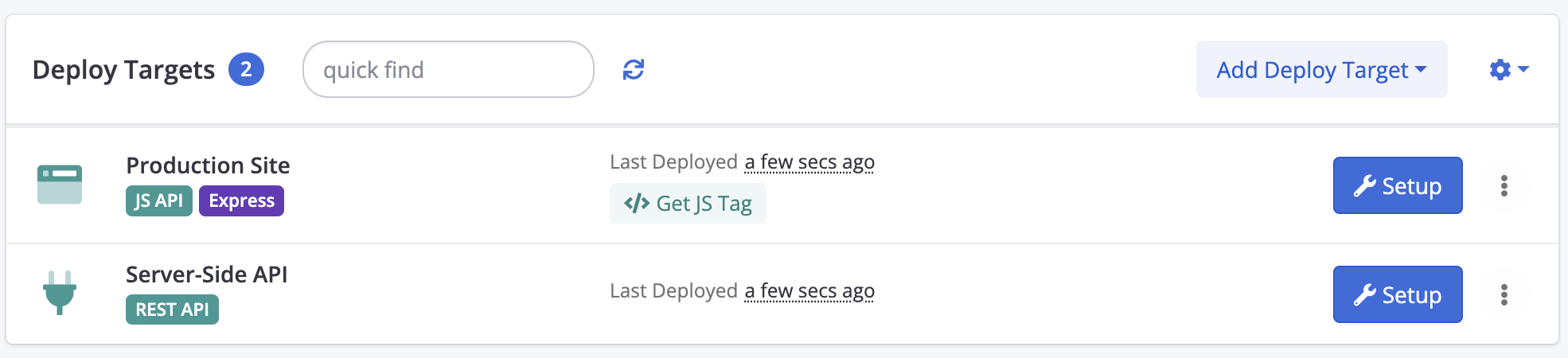 - Click Setup for your Deploy Target.