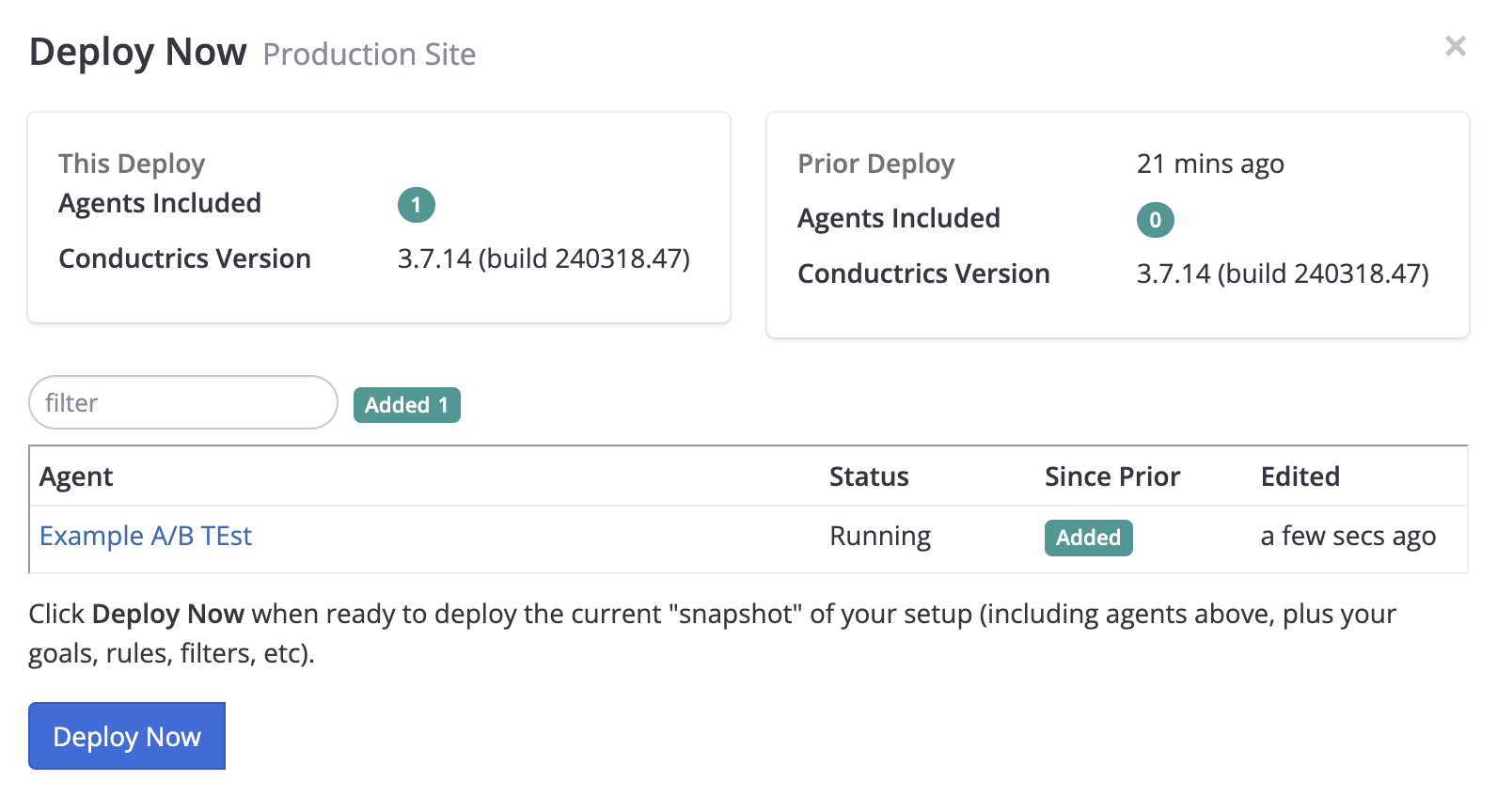 If everything looks good, simply click Deploy Now to confirm, and a snapshot of your Conductrics setup will start rolling out to your visitors.