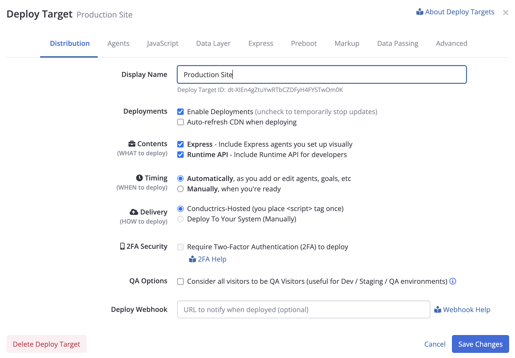 For instance, if you have a separate QA or Staging environment, you may want to be able to deploy to the QA/Staging environment separately from your real (e.g. production) environment. In such a case you can give each environment its own Deploy Target so you can manage when changes to agents, goals, and other Conductrics settings get deployed to the two environments separately.