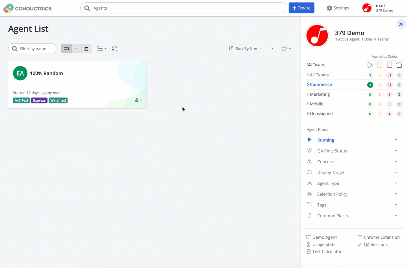 - If you haven't already, hit the Create button at the top of the Conductrics Admin to start Creating an Express Agent.