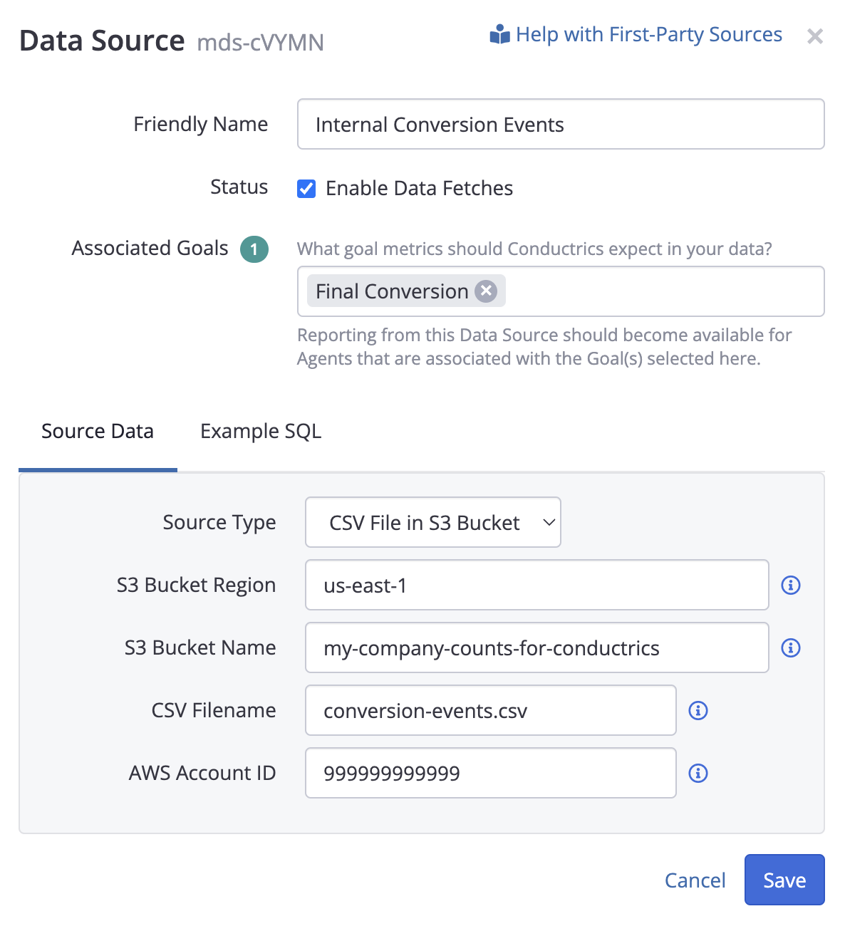 - Your systems will need to place the resulting CSV file in a (secured, private) S3 Bucket that Conductrics can fetch the files from. See the S3 Bucket / Permission Requirements section below.