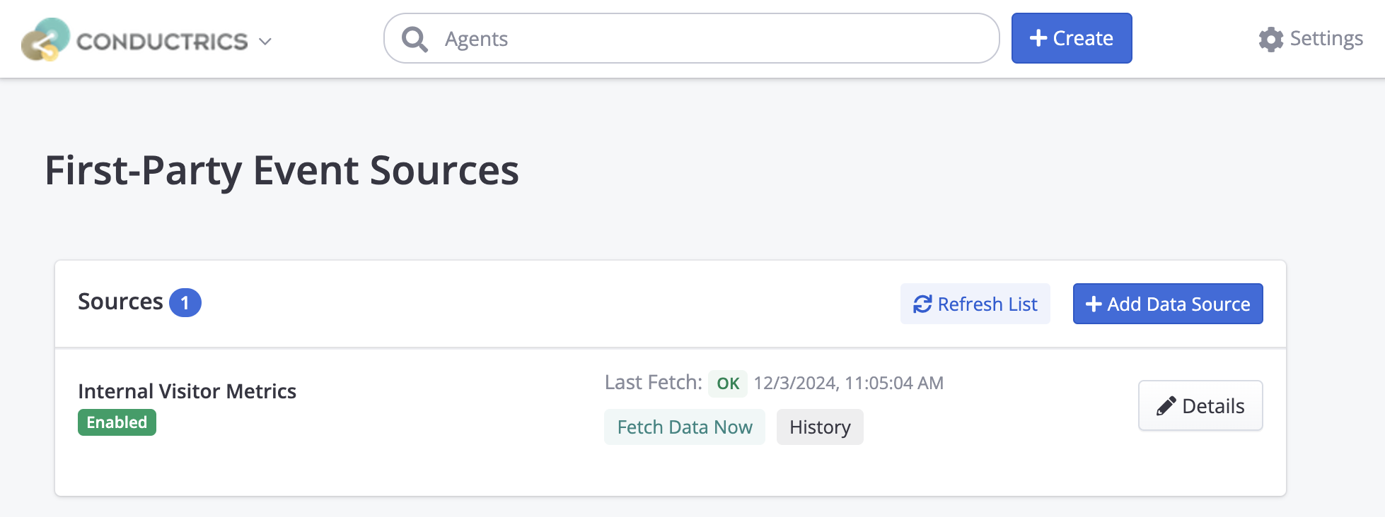 - Return to Settings > First Party Reporting in the Conductrics Admin, then hit the History button for your Data Source.