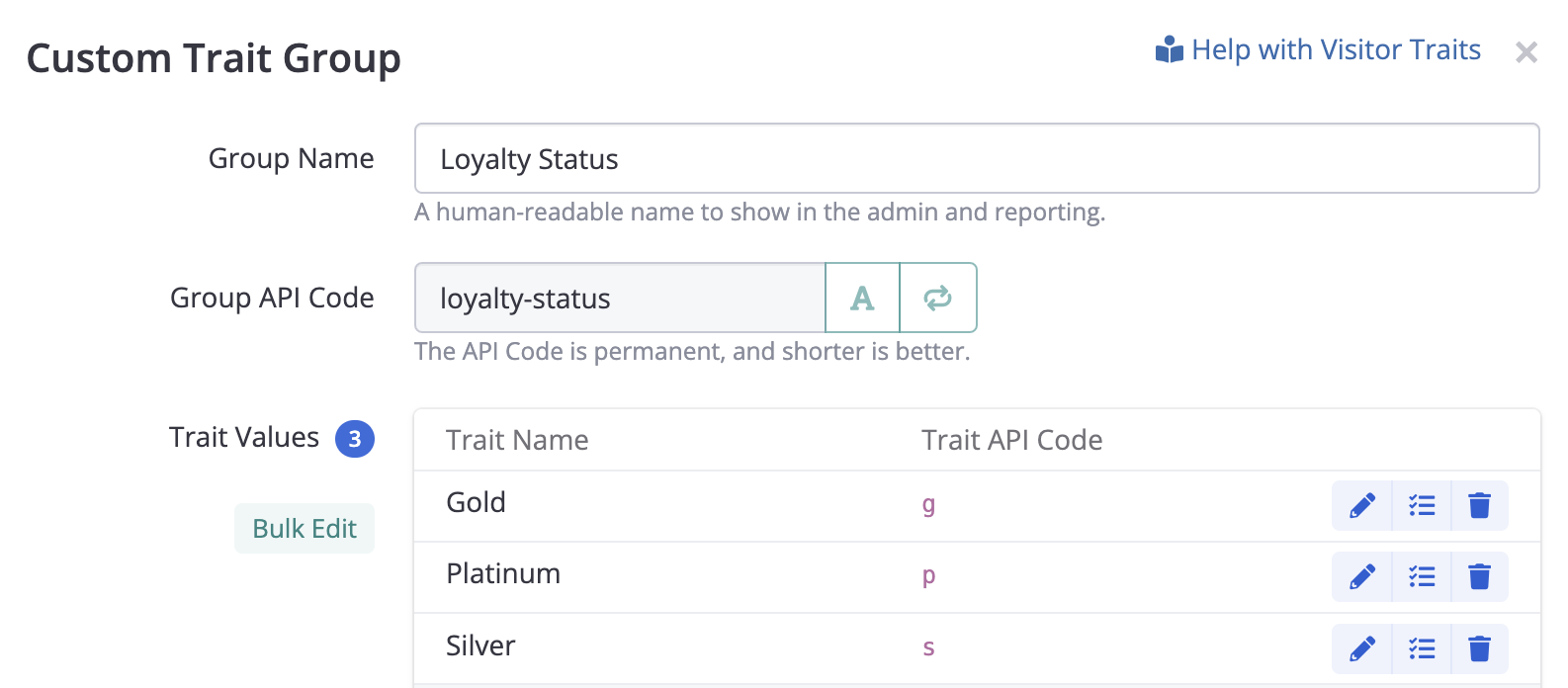 For instance, if you had a Custom Trait Group like this (under Settings > Visitor Data), then the corresponding rows in the CSV file should have loyalty-status for the Trait Group column, and g or s or p to indicate Gold / Silver / Platinum.