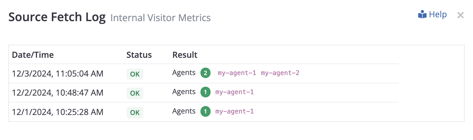 If the fetch was not completed successfully, the Status column in the Fetch Log (see above) shows Error, with the type of error displayed in the Result column in place of the agents.