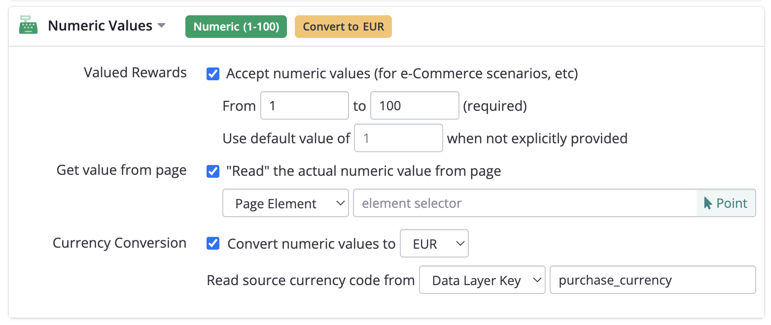 Pulling the numeric value from your Data LayerIf you are using our Data Layer Support, you can change page element above to Data Layer Key and provide the exact name of the data layer property (key) that will hold the numeric value. You may use dot notation if the value is nested within the data layer model.