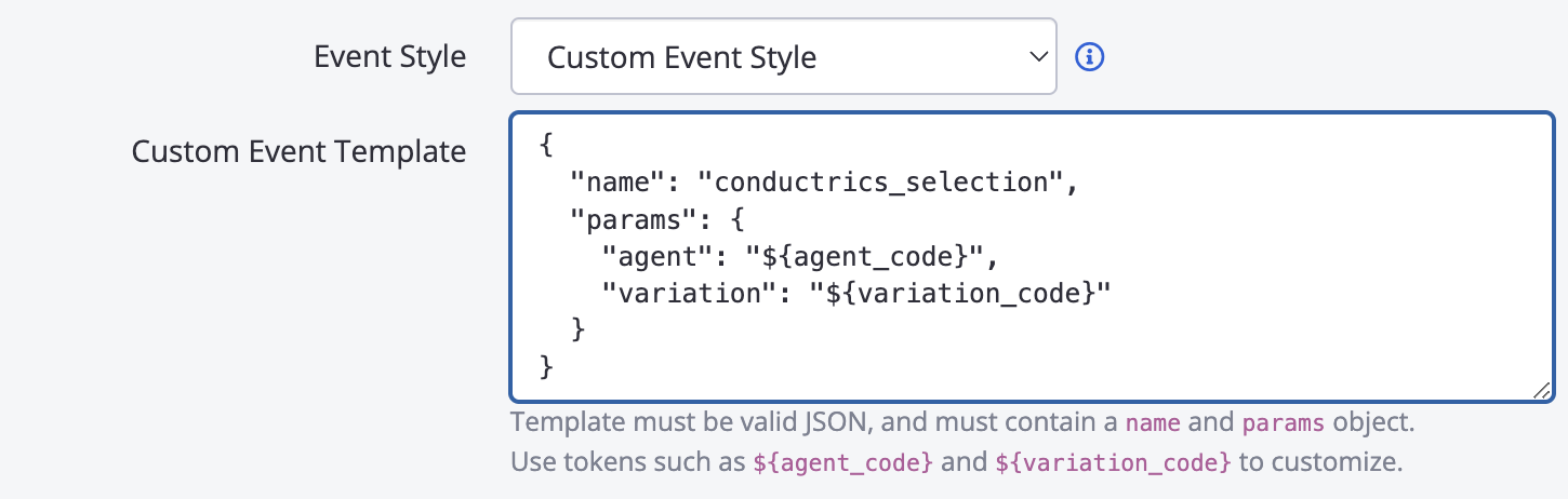 ${agent_code}will be replaced with the actual Conductrics agent code (unique identifier)${agent_name}will be replaced with the agent's friendly name (as displayed in the admin)${variation_code}will be replaced with the selected Variation code (such as "A" or "B")${variation_name}will be replaced with the selected Variation's friendly name (such as "B Variation")${policy_code}will be replaced with the Selection Policy used for the variation selection (such asrfor a "normal" random selection for an A/B experiment, orfif a fixed rule was used instead of random, etc).