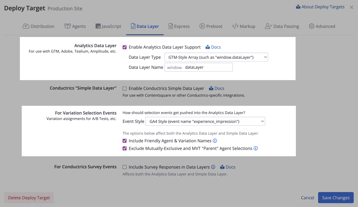 If you are using GA4, it generally makes sense for your GA reporting to be aware of each visitor's variation assignments for any Conductrics-powered A/B Tests (or predictive targeting campaigns, etc).