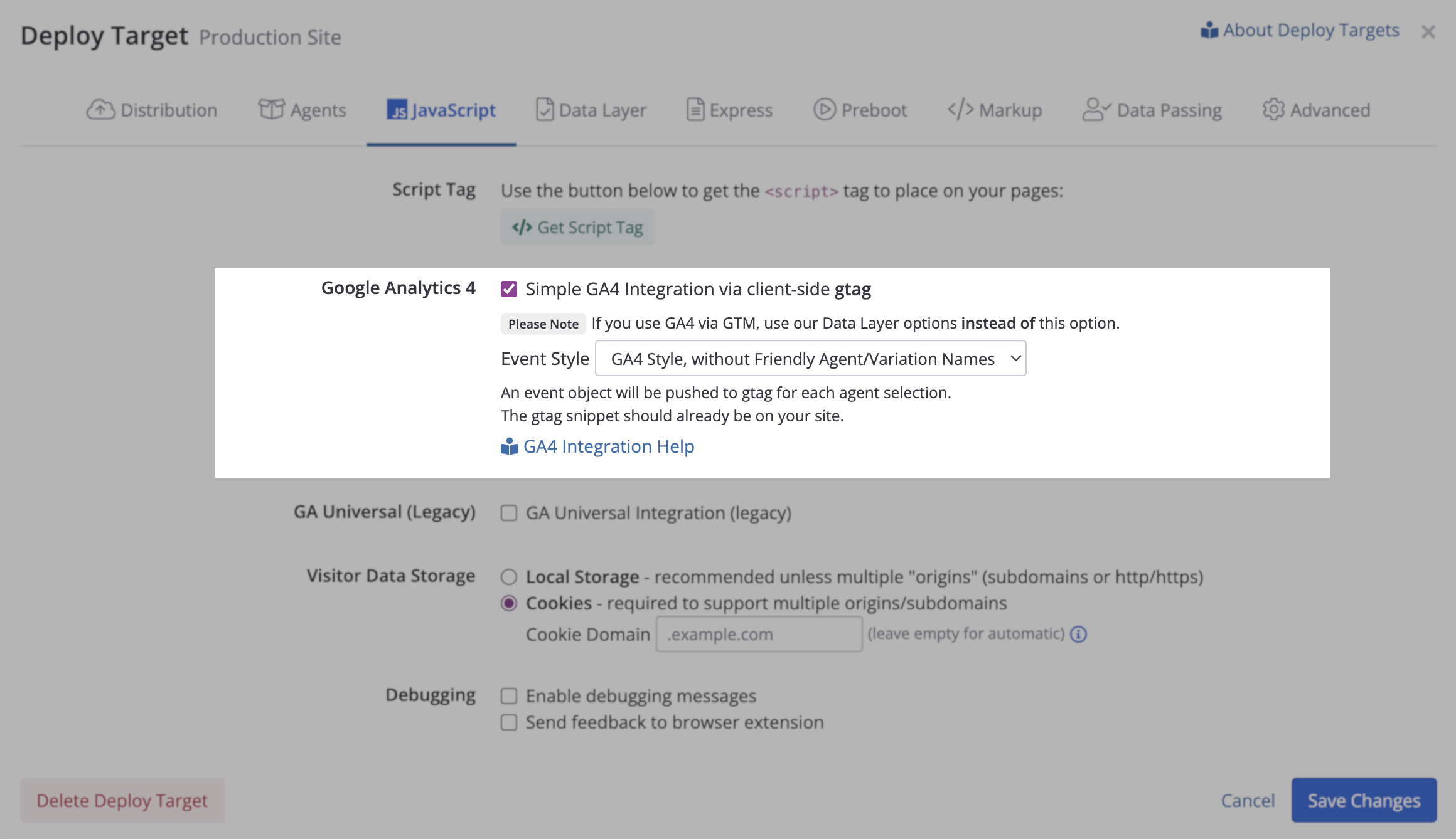 - Under the JavaScript tab, enable the Simple GA4 Integration via client-side gtag option as shown below.