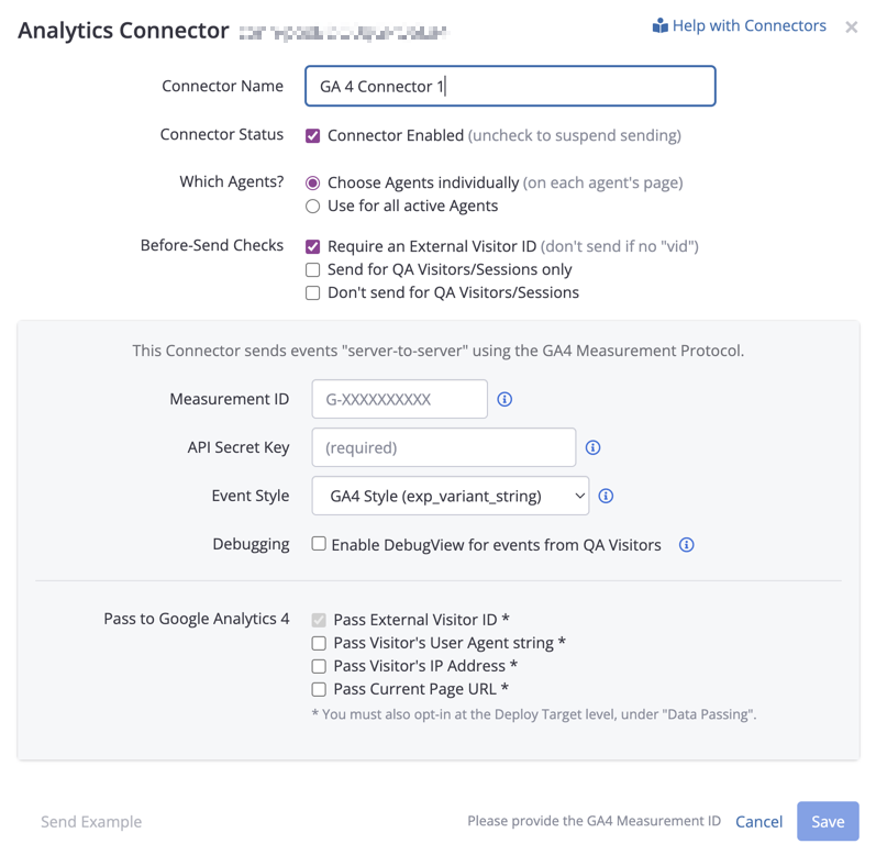 - Click Add Connector > GA4 Connector which will launch the form shown below.