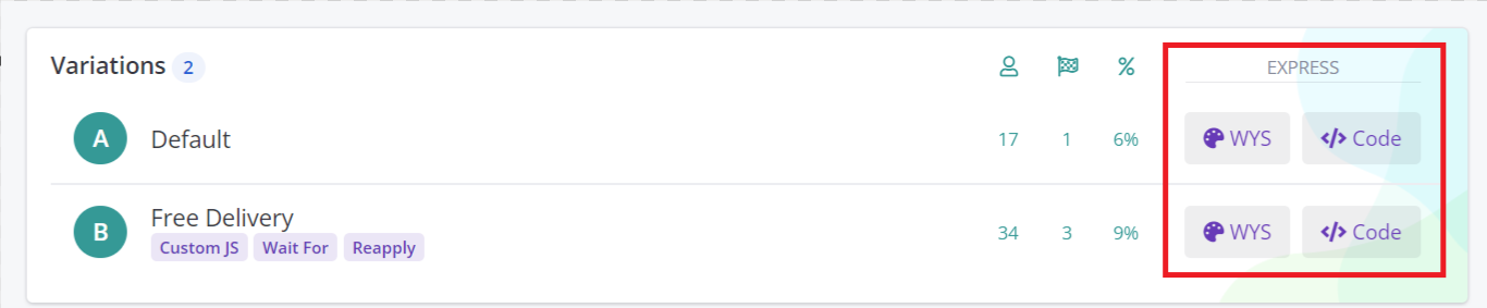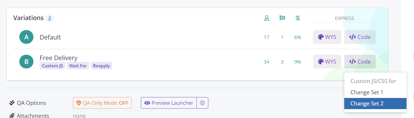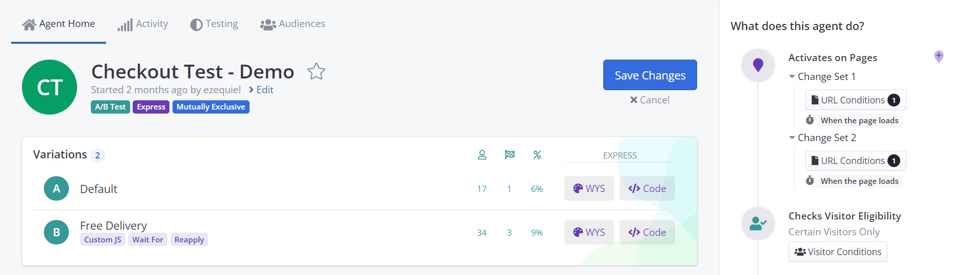 With this, you have already set up the agent to include multiple triggers across different URLs. Now the next step should be to add the necessary changes to this new Change Set on /secondpage. The way to proceed is the same as when setting up the agent for the first time, which means, selecting either the WYSIWYG or the Custom JS options for the corresponding variant as follows: