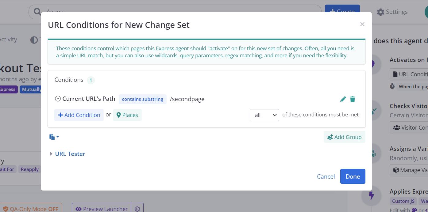 This will open up a modal for you to set any conditions for this second set of pages / screens where you would like this agent to make changes in. So for example if your agent as already set to do changes on /firstpage, now you can include /secondpage as the new URL condition for this new Change Set, like below.