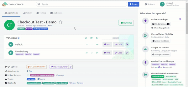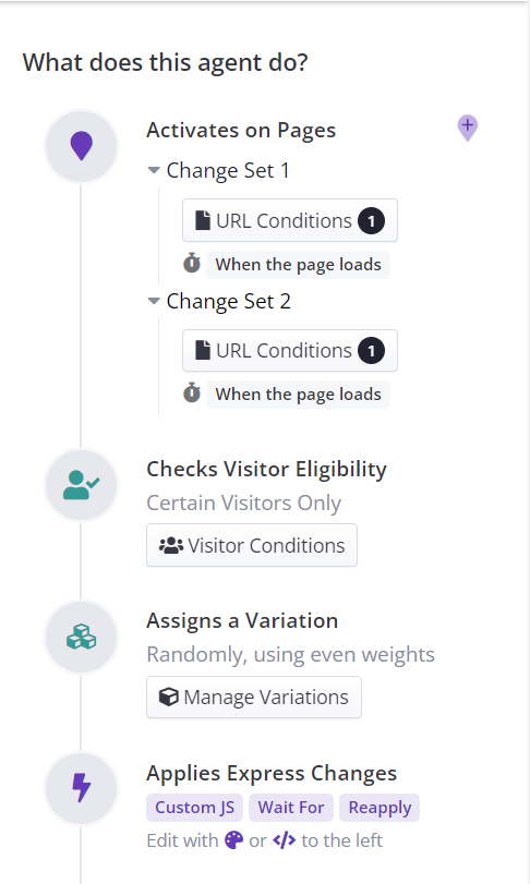 Sometimes for a given agent, be it AB test or Targeting, the variations needs to perform changes across diferent pages, URLs, screens or views. The way to do so with Conductrics is by making use of Change Sets.