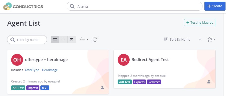 To create a MVT, all we need to do is tell Conductrics to create a new test that 'merges' the OfferType test with the HeroImage test. To do this, start by clicking the Create button just like you would with any other agent.