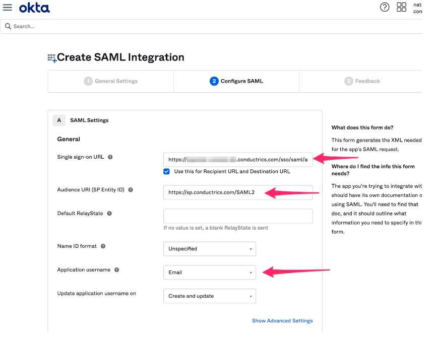 - SP Entity ID: https://sp.conductrics.com/SAML2