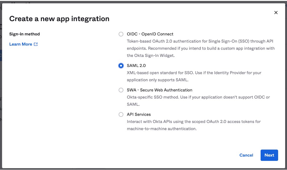 - Specify SAML 2.0 as the "Sign-in Method" (see screenshots below)