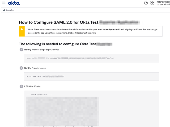 Once you’ve created the Conductrics Application in Okta, go to the “Sign On” tab for the Conductrics app (still in the Okta admin). You should see a View SAML setup instructions button in there. That should give you a page that looks like this: