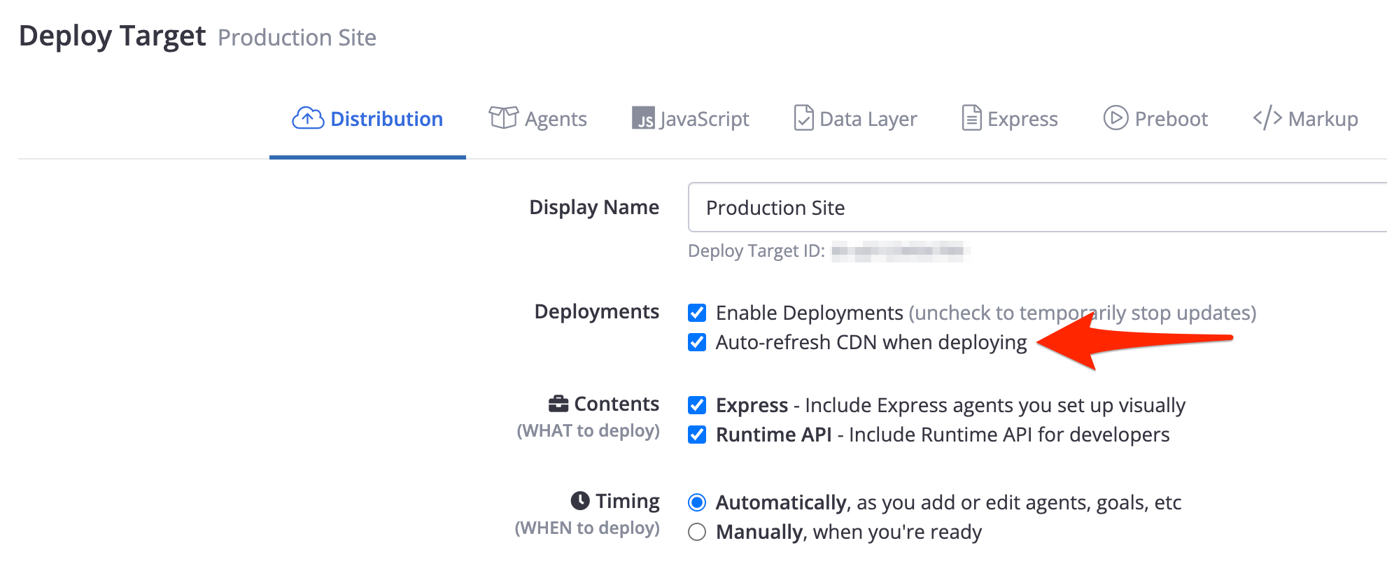 Once the above has been set up on our side, you should be able to check the Auto-refresh CDN when deploying option for each Express/JS deploy target, if it's not checked already: