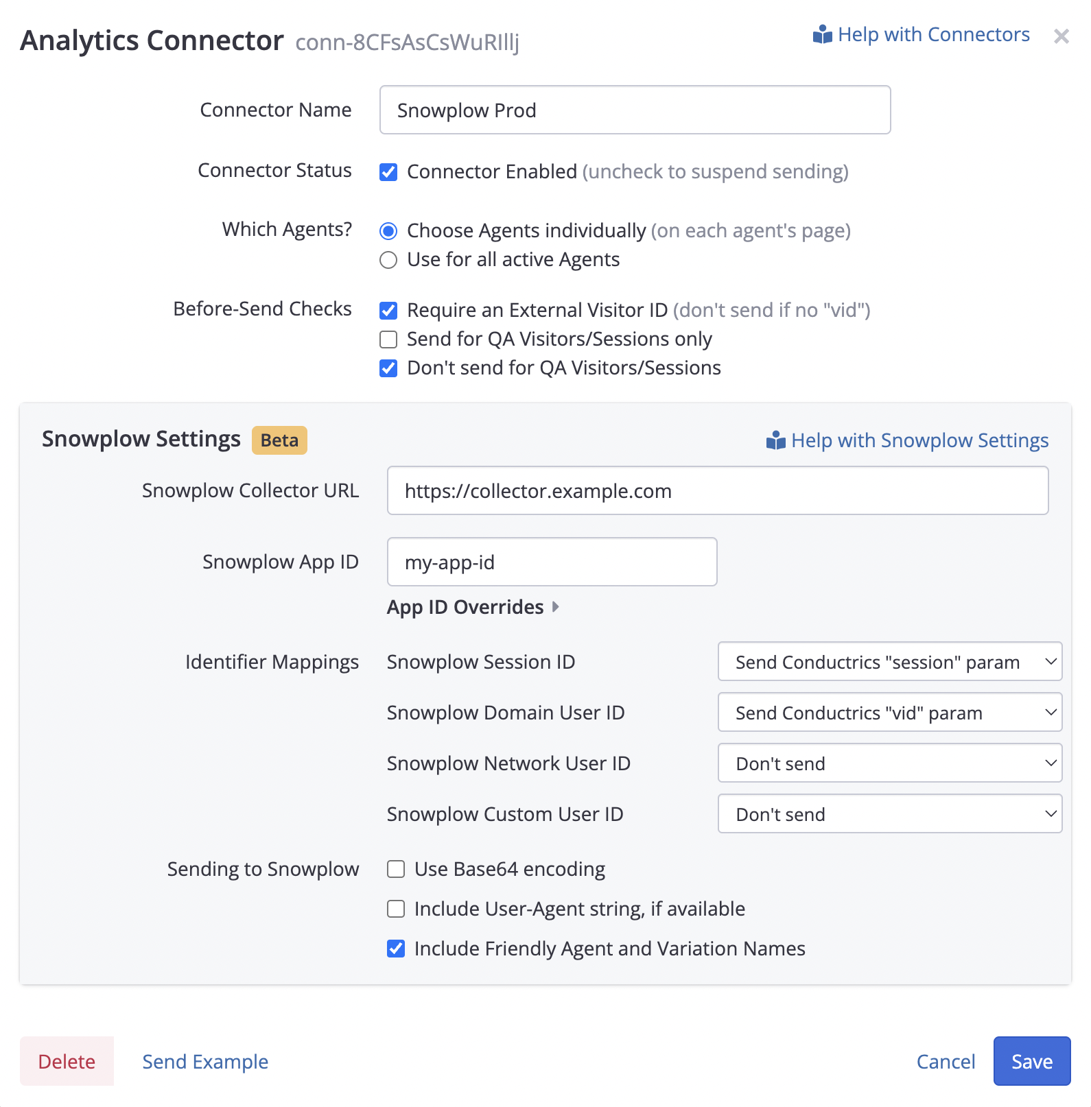 https://example.collector.snowplow.ioorhttps://collector.snowplow.example.comdepending on whether you are self-hosting. Please do not provide the/com.snowplowanalytics.snowplow/tp2portion (we will add that automatically). - The Snowplow App ID that Conductrics should provide when sending events to Snowplow. This is a custom identifier that you would presumably also be using when sending events from your own application.