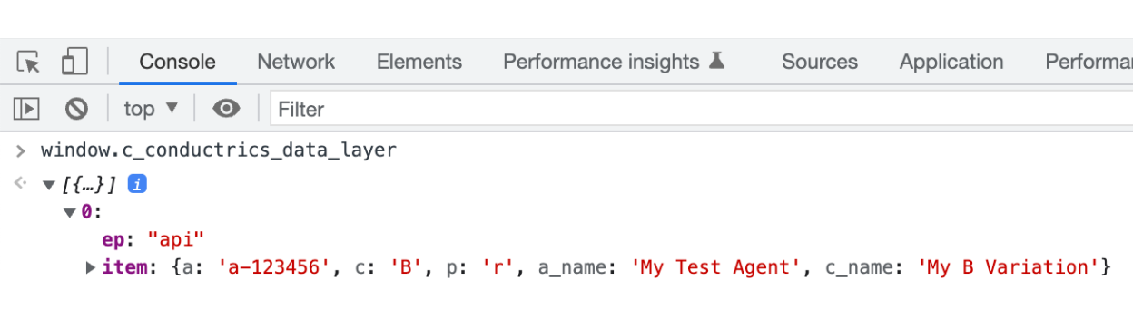 </script>When the page actually runs in the browser, we would then expect to be able to type window.c_conductrics_data_layer in the browser's JS Console and see something like this: