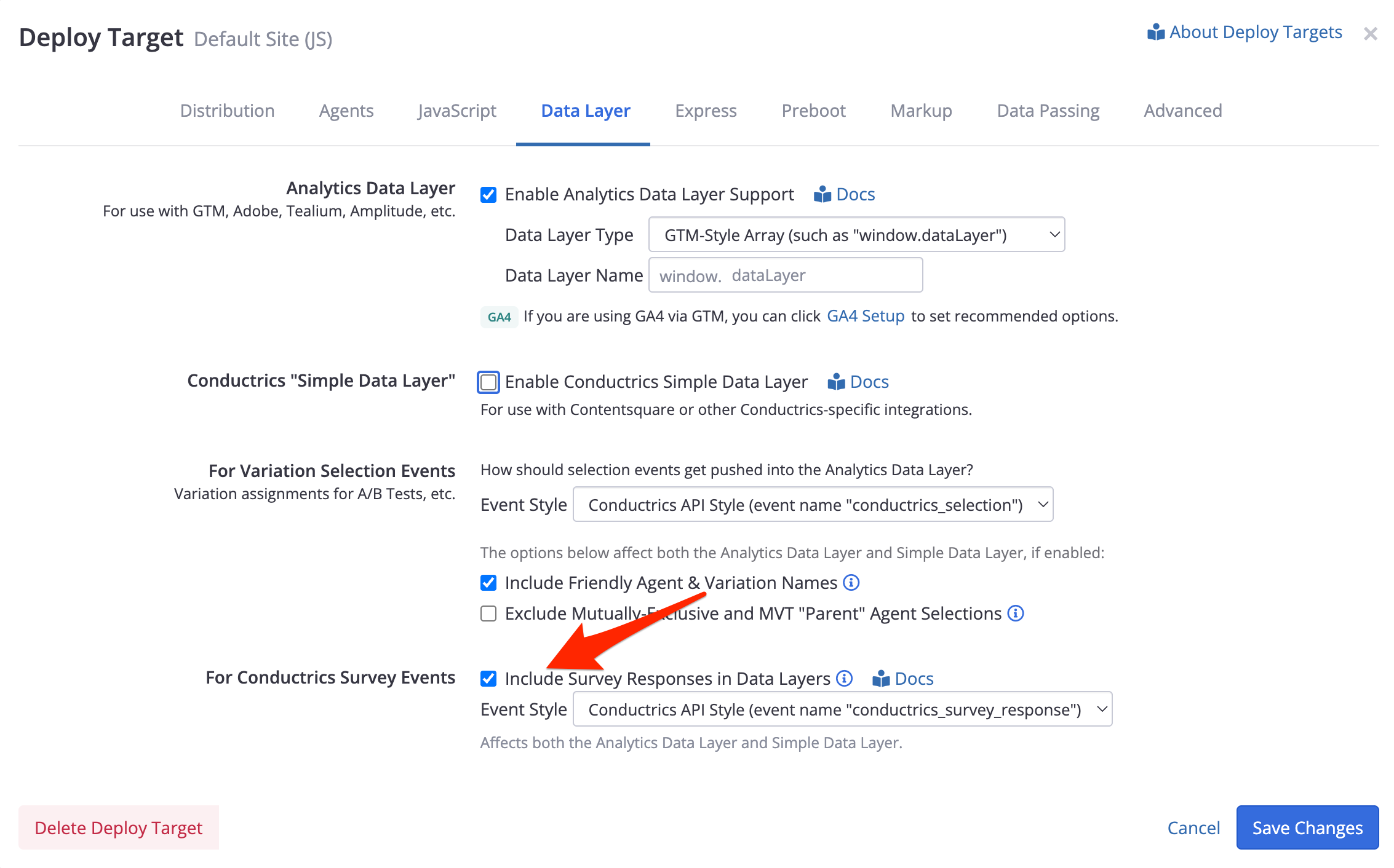 To tell Conductrics to push Survey Responses into the Data Layer:
