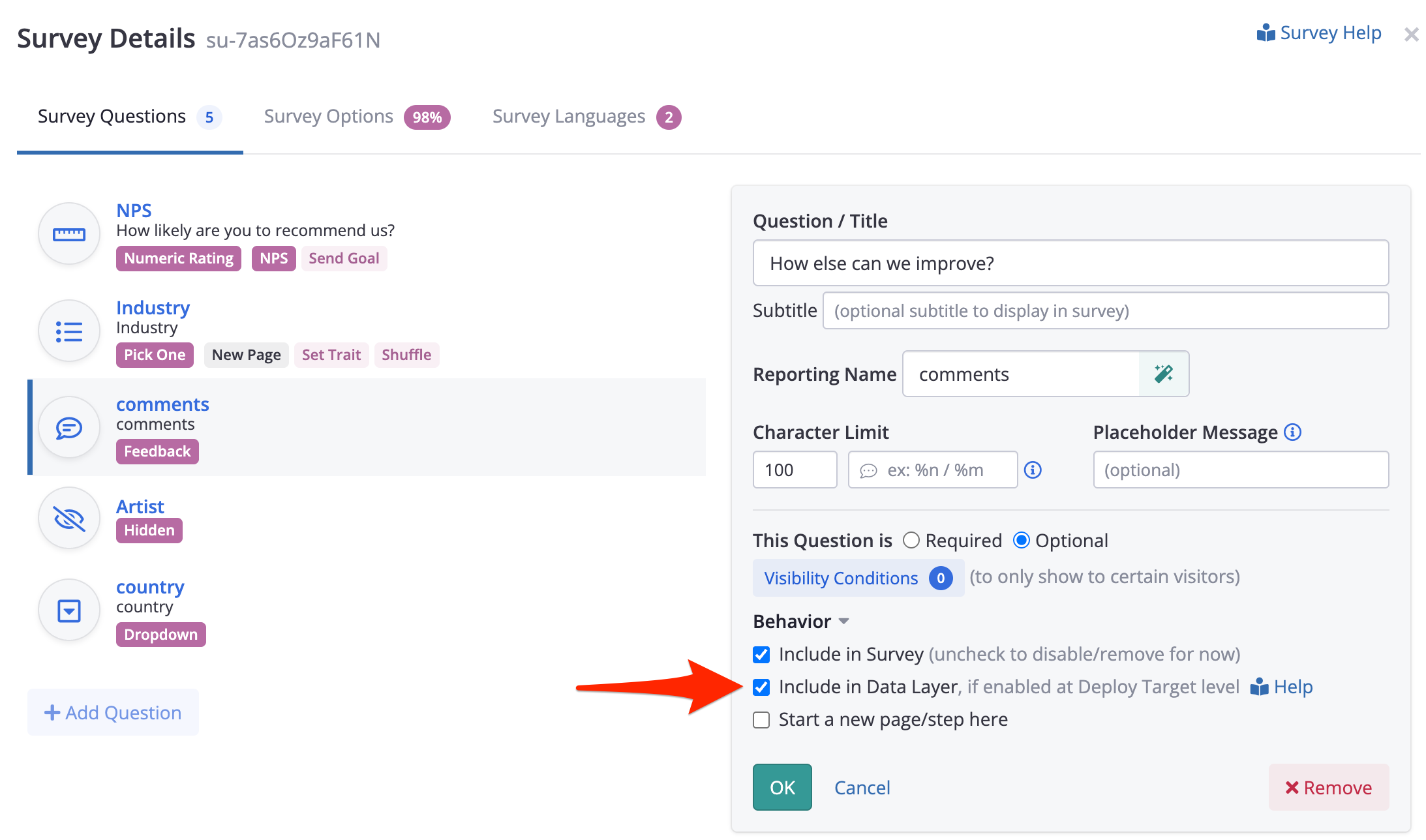 If there are some questions that shouldn't have their answers included in the Data Layer, you can uncheck the Include in Data Layer option at the Survey Question level, as shown below.