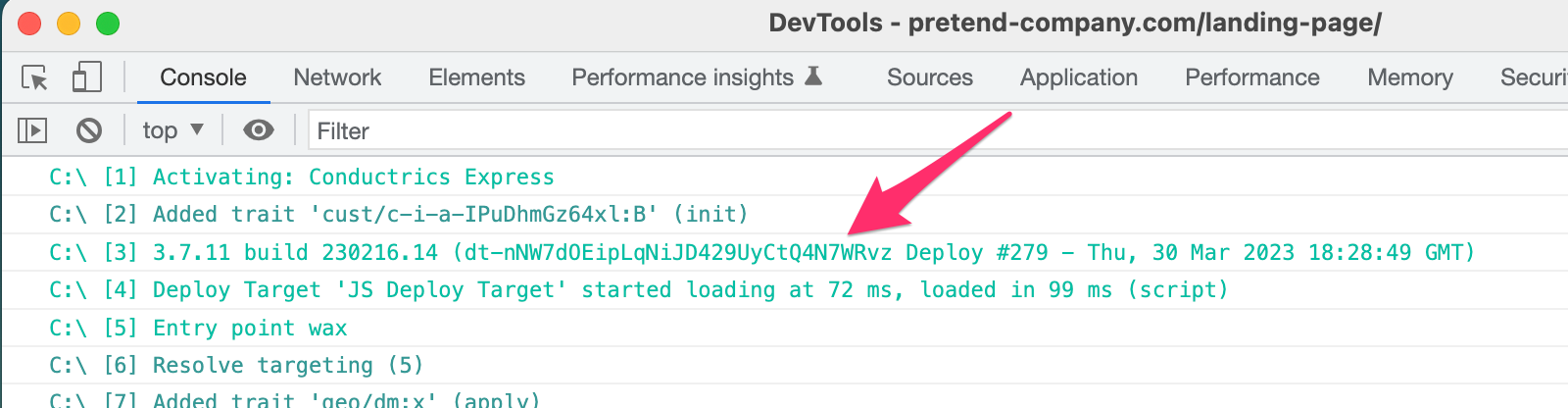 - The Conductrics script URL currently being used on your pages (which you can get from the page's HTML source, or from the Network tab of your browser's Developer Tools, or from the Conductrics Admin under Settings > Deploy Targets).
