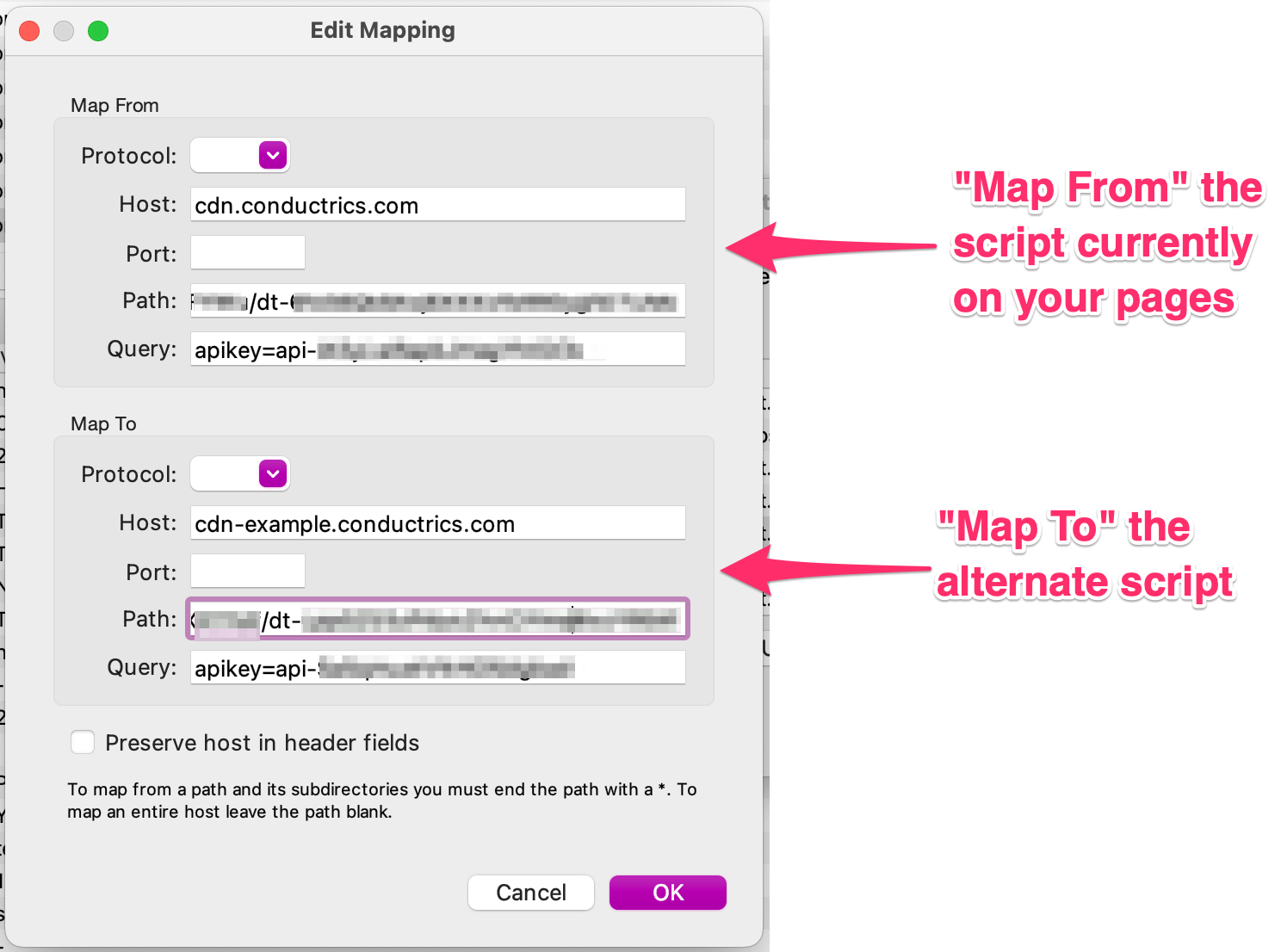 - In the Map From area, provide the Host, Path, and Query for the script URL currently on your pages (see screenshot below).